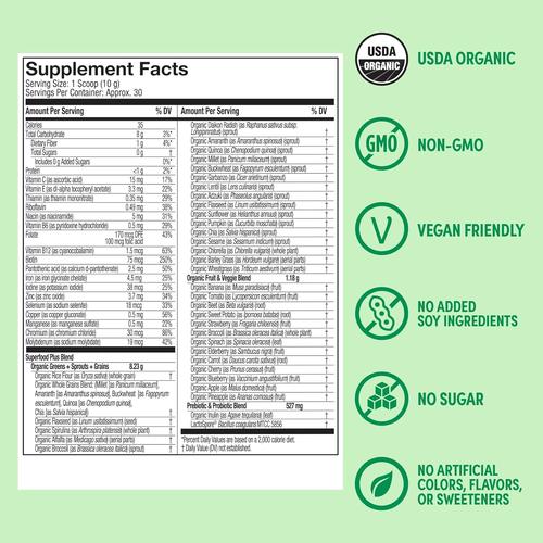 Purely Inspired USDA Certified Organic greens supplies you with an ultra clean formula that contains no artificial sweeteners, colors or dyes to ensure you are only getting the highest quality superfoods and multivitamins. This convenient greens powder can be added to smoothies, soups or sauces. 100 percent vegan friendly and non GMO its an excellent way to add key greens to your daily diet.