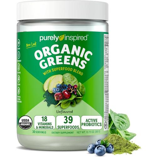 FROM AMERICA’s 1 FASTEST GROWING SUPPLEMENT BRAND – Purely Inspired Organic Greens Powder smoothie mix delivers 39 superfoods, 18 vitamins & minerals and active probiotics with just 1 scoop. 40 Calories per serving
