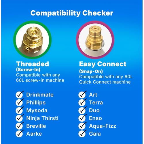 [Canister Compatibility] We don't mind if you call it a canister, cylinder, tank, or cartridge! But remember that our pink capped, Easy Connect canisters are compatible with all SodaStream Quick Connect soda makers including ART, TERRA and Duo. If you own a soda maker which requires a 'screw-in' canister, you will need to purchase our green capped, Threaded canisters.