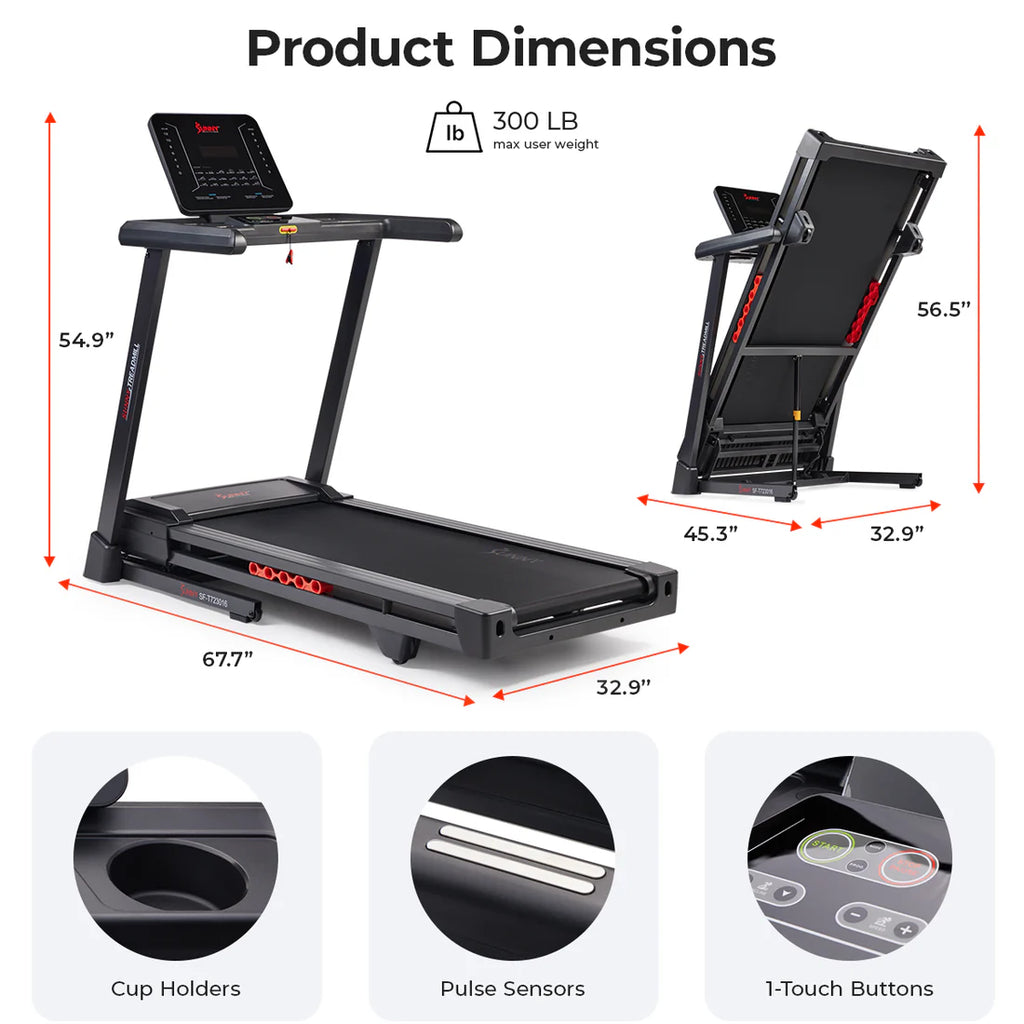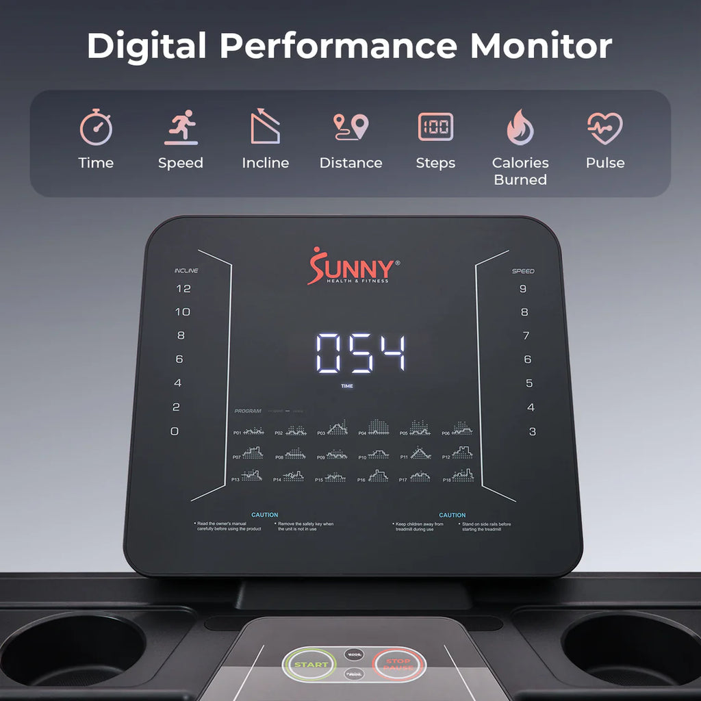 The Sunny Health & Fitness Treadmill Elite Smart Auto Incline is designed to help you achieve your fitness goals with advanced features and robust construction. Its 20-inch-wide running deck allows for natural strides and enhanced comfort, while supporting up to 300 LB for a stable workout experience. Bluetooth connectivity offers access to 1000+ workouts and 10,000+ scenic routes, with real-time progress tracking. Challenge yourself with 15 auto incline levels up to 6.45° and 18 preset programs. Reach speeds up to 12 MPH with the 3 HP motor, while advanced shock absorption ensures a smoother workout. The digital performance monitor tracks key metrics, and the treadmill includes handrail pulse sensors and Sunny Heart Rate Monitor HR200 compatibility. For convenience, it features two cup holders, a display holder, and a USB charging port. The foldable soft drop system makes storage easy. Sunny Health & Fitness, with over 20 years of excellence, provides top-quality equipment and exceptional customer service.