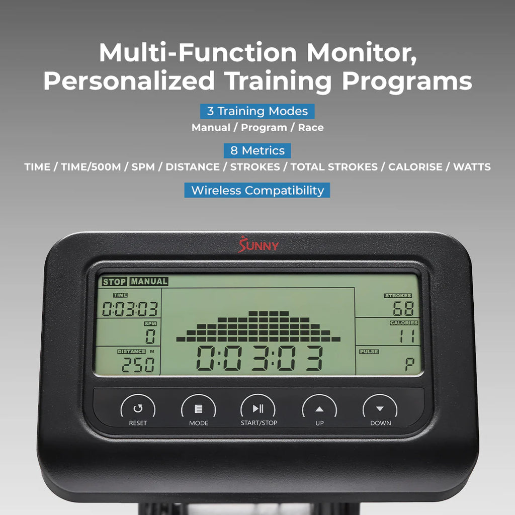 Achieve elite fitness at home with this pro-grade rower that adapts to every level—from daily cardio to competition-ready training. Its dual-resistance system (16-level magnetic + Air-Blade technology) delivers low-impact, high-power full-body workouts, while the extended 52.6" steel rail accommodates users up to 6'9" with commercial-grade stability. Fold it vertically to save space without sacrificing performance and enjoy real-time metrics on the competition-ready monitor, tracking everything from stroke rate to calories burned. Enhance every session with lifetime SunnyFit app access, featuring 1,000+ guided workouts and scenic global routes. The ergonomic handlebar, cushioned seat, and POM rollers ensure comfort during marathon sessions, while Apple Watch/HR200 compatibility keeps your heart rate in check. Backed by 20+ years of U.S. expertise, this rower combines pro engineering with thoughtful details—transport wheels, a device holder, and safety alerts—for a truly seamless experience. Fit for everybody, built to outlast.
